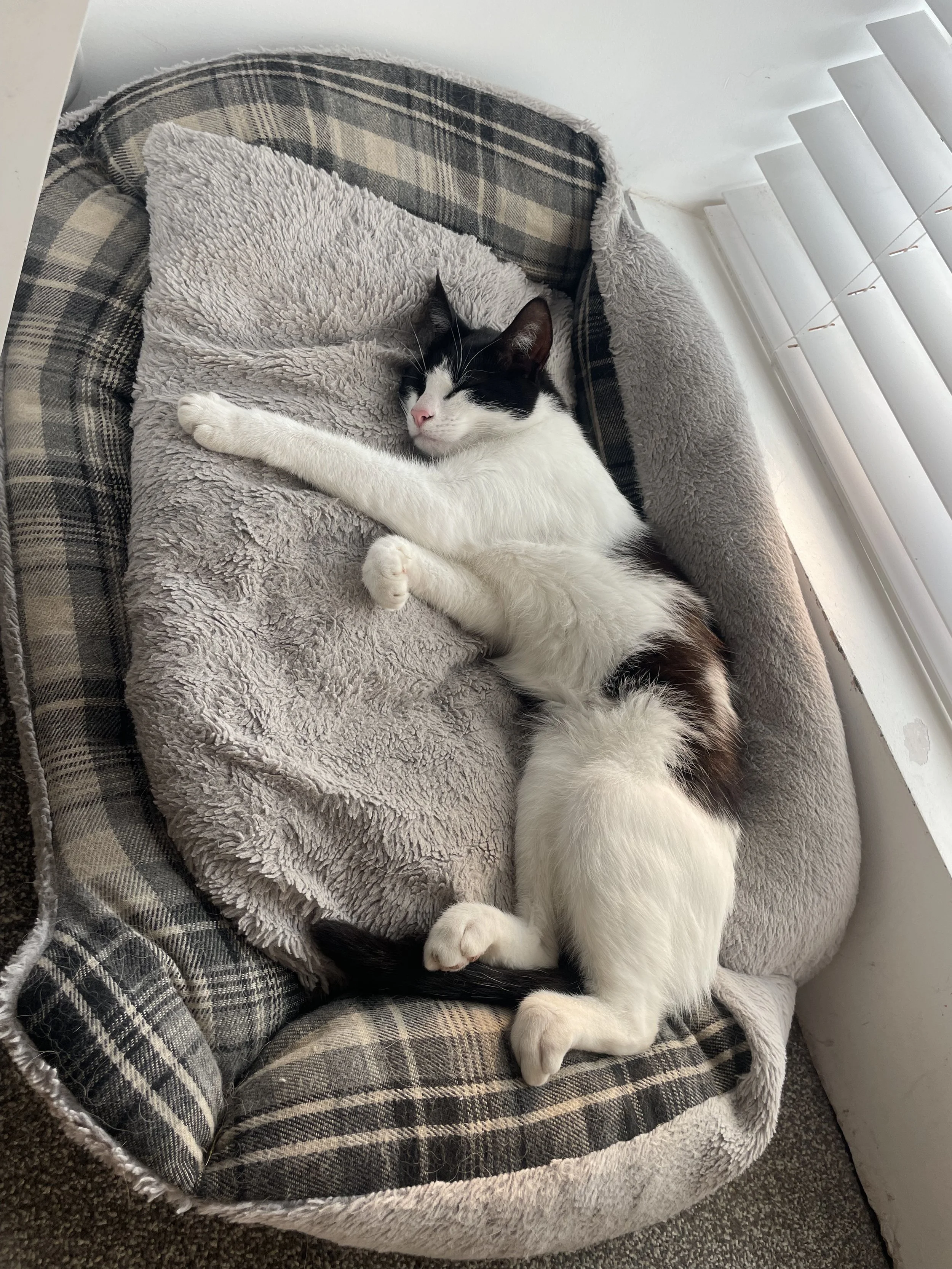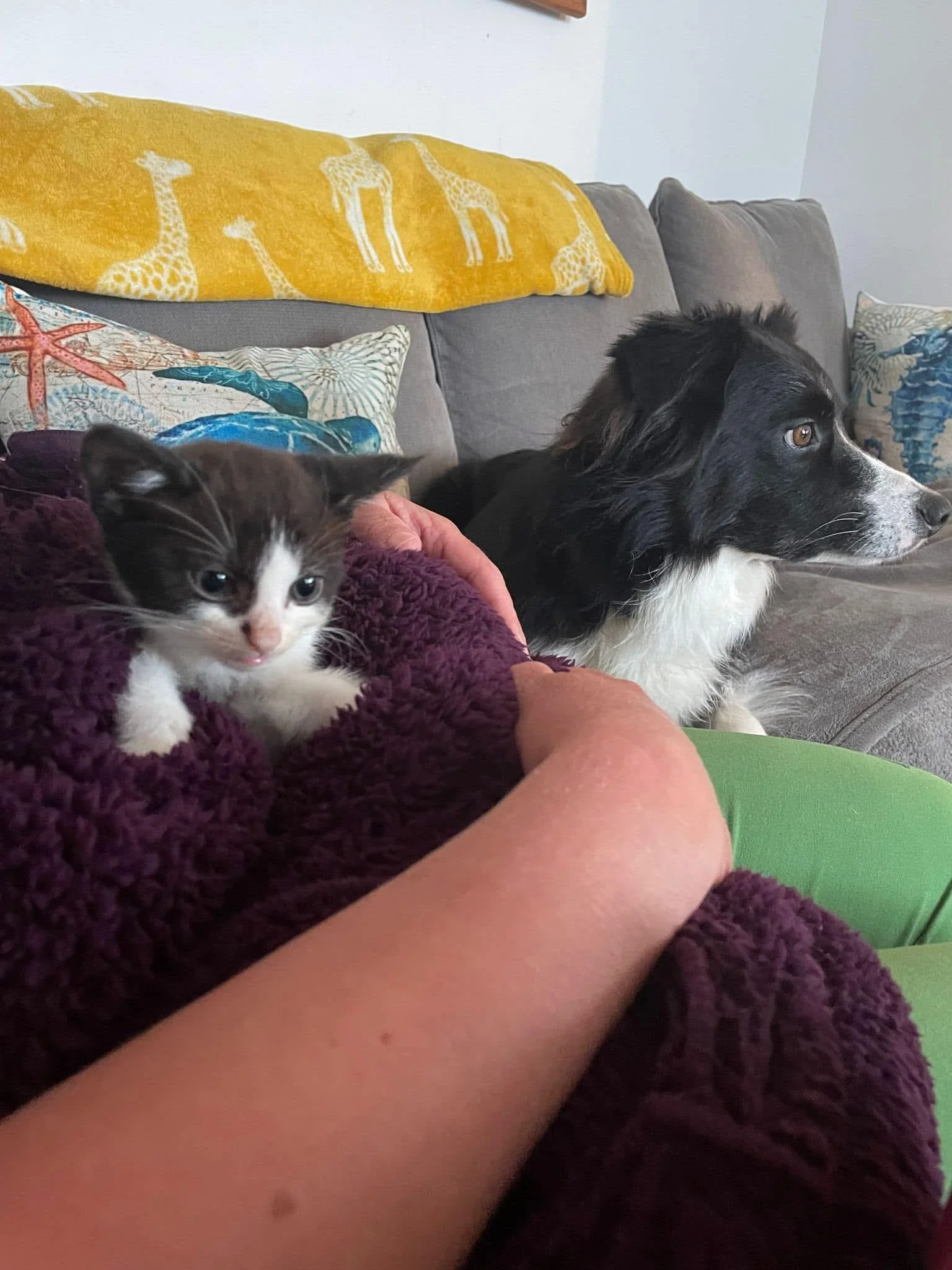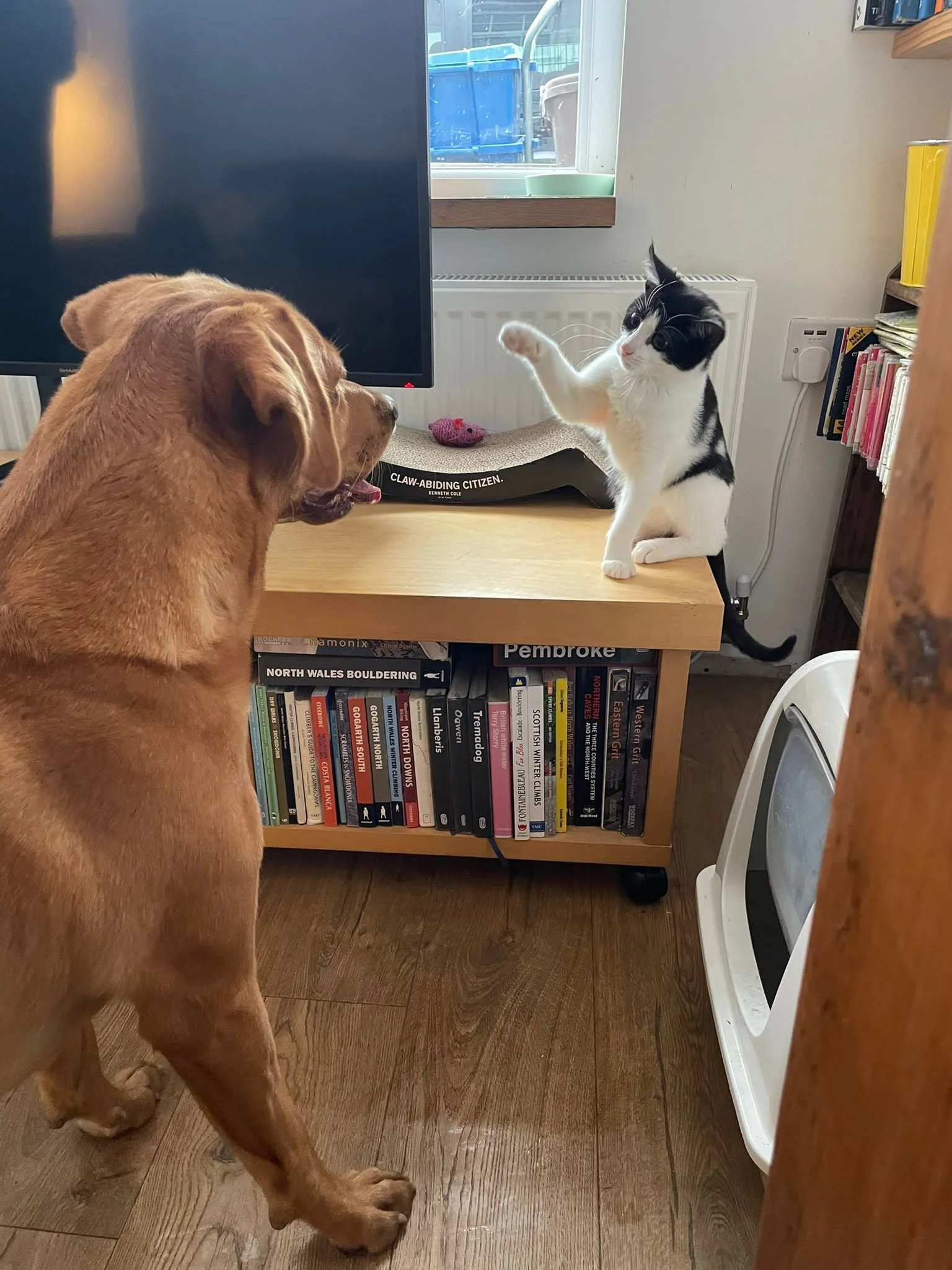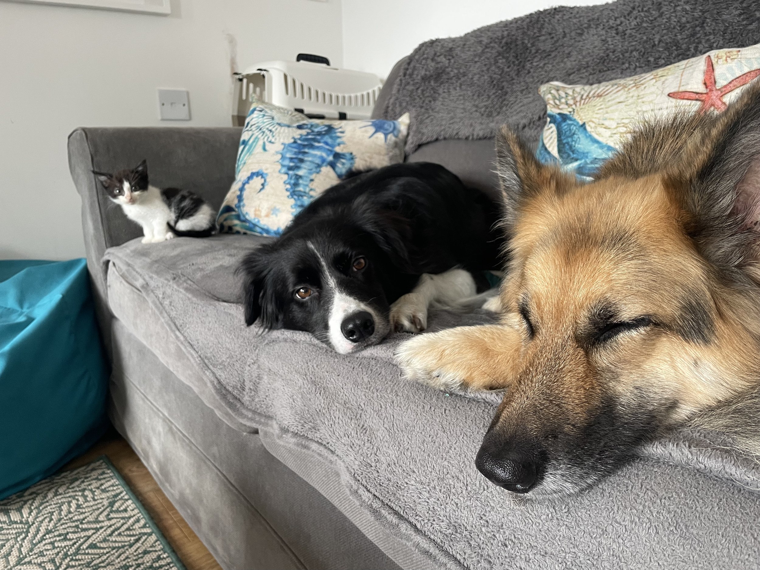 Toilet break, food/water (as required). Clean litter tray for cats and playtime!